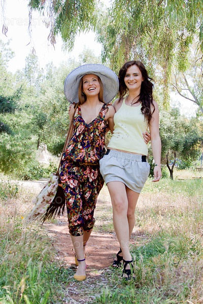 Две молодые, красивые, веселые женщины гуляют в парке
