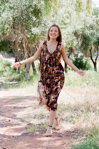 Фотография молодой, красивой и счастливой женщины гуляющей по парку
