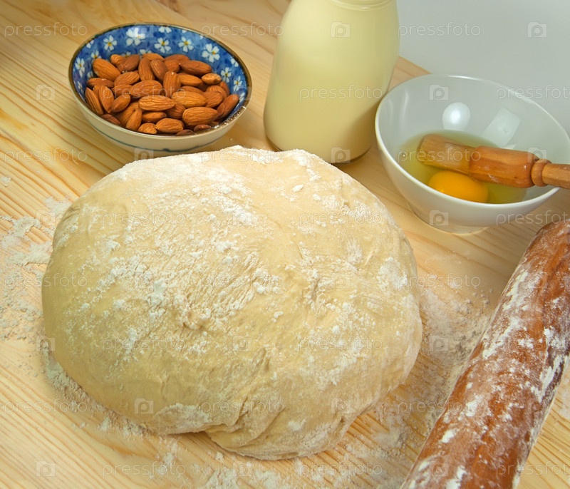 Сырое тесто, скалка, яйцо в чаше, миндаль и молоко