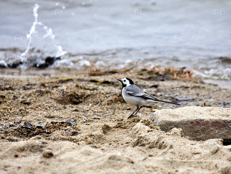 Трясогузка в поисках пищи на берегу озера