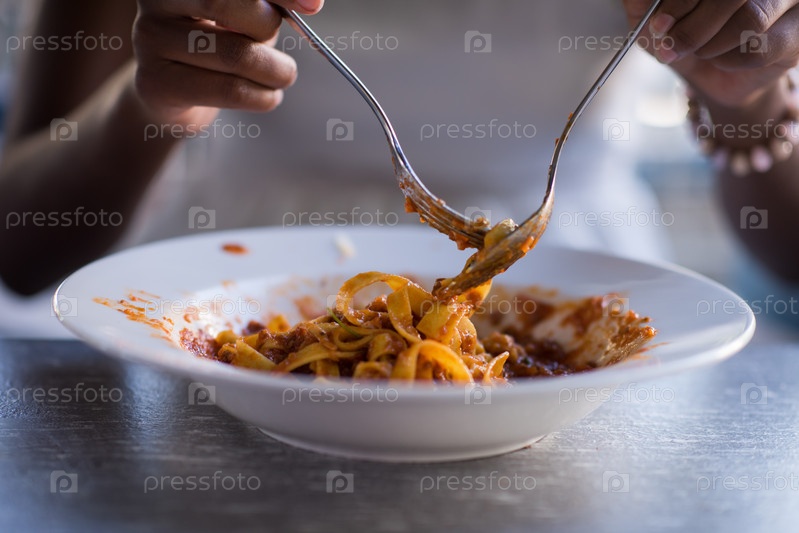 Девушка кушает макароны