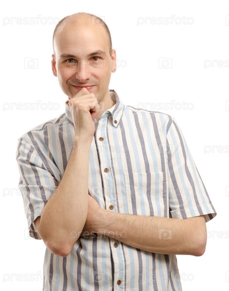 Молодой мужчина держит руку у подбородка на белом фоне