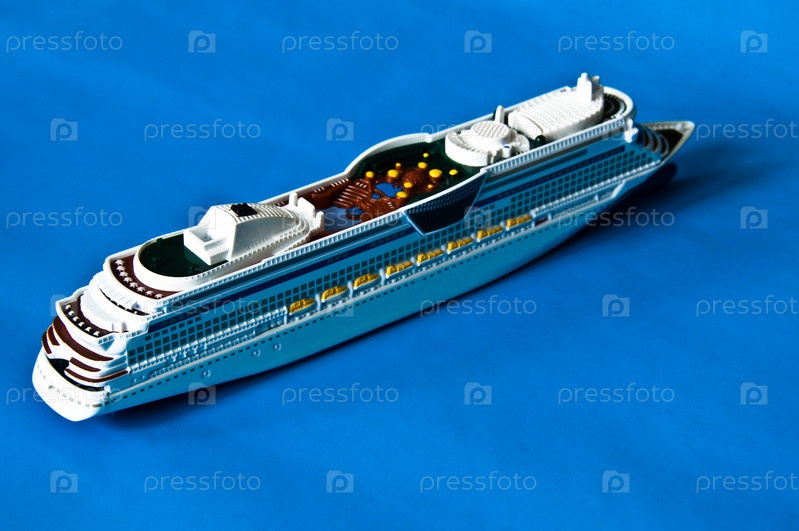 Миниатюрная модель круизного лайнера на синей бумаге