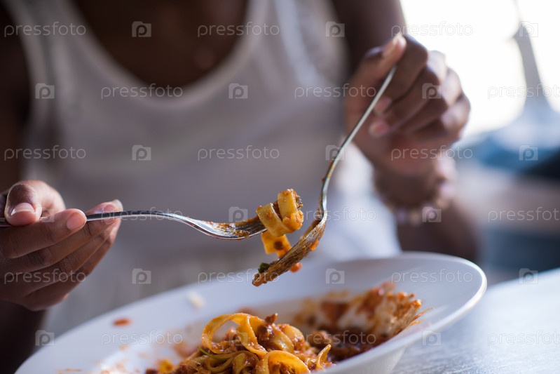 Девушка кушает макароны