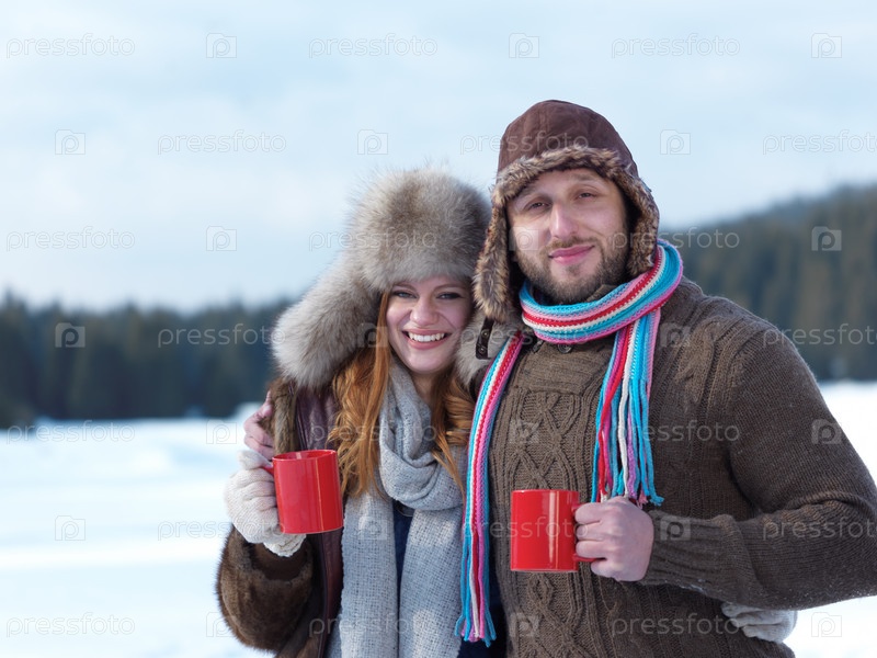 Счастливая пара с горячими напитками