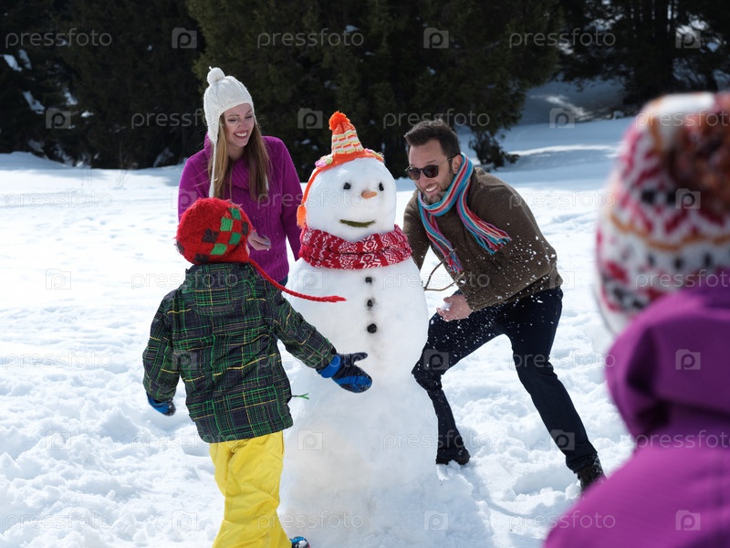 Семья лепит снеговика