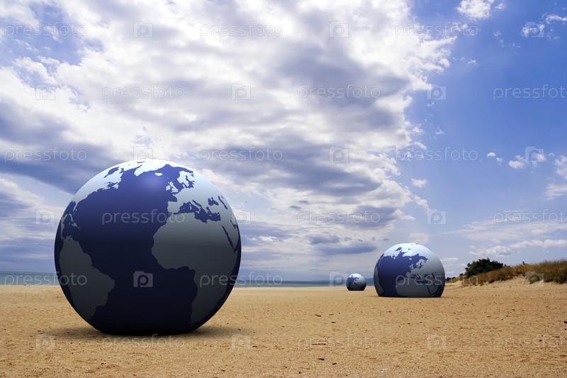 Земные шары на песчаном пляже