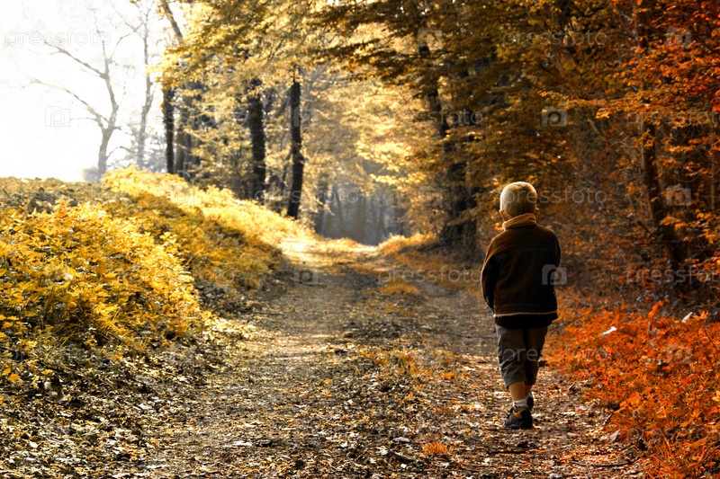 Маленький мальчик идет по дорожке в осеннем парке