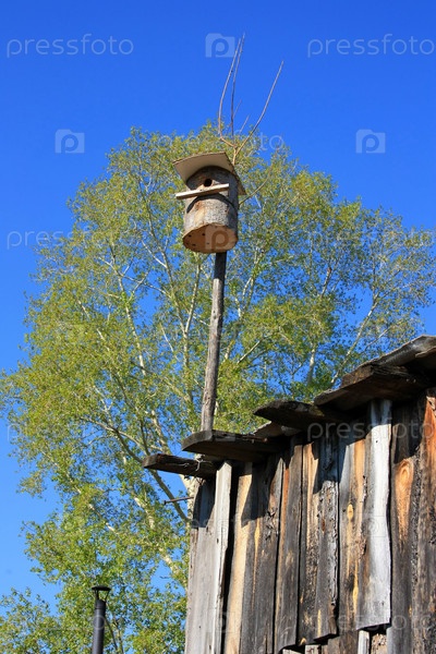 Скворечник на крыше деревенского дома