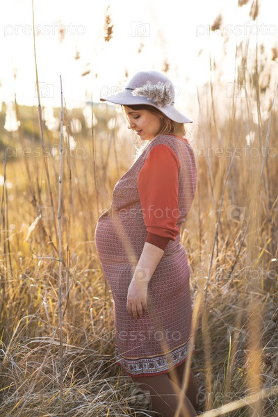 Молодая беременная женщина на открытом воздухе на закате