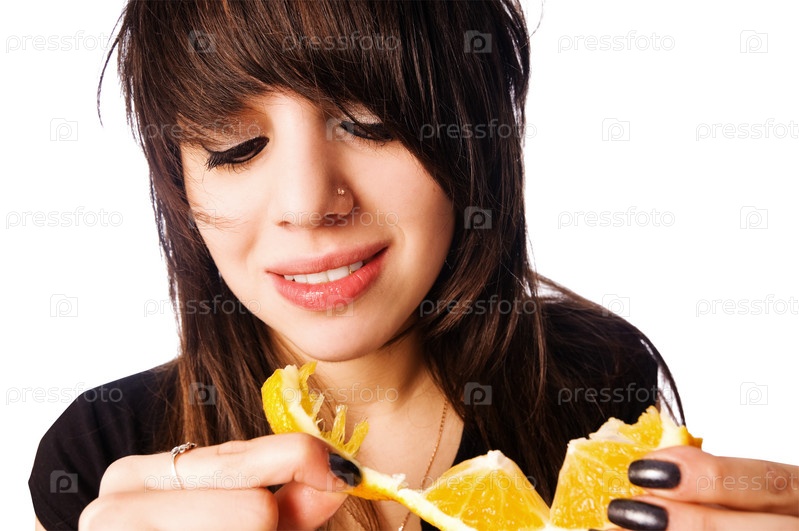 Девочка-подросток ест апельсин, изолированная на белом фоне