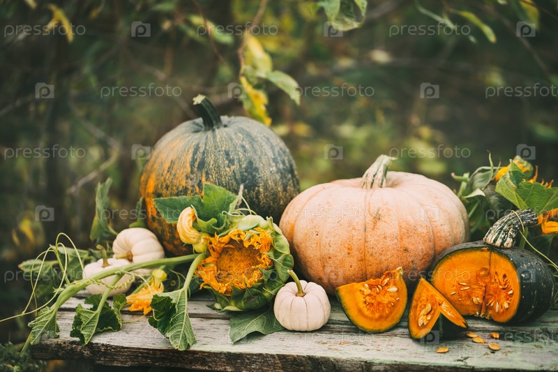 Сырые тыквы в осеннем саду