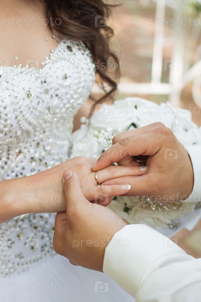 Жених надевает кольцо на руку невесты