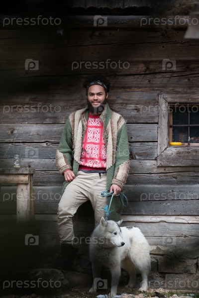 Хипстер с собакой перед деревянным домом
