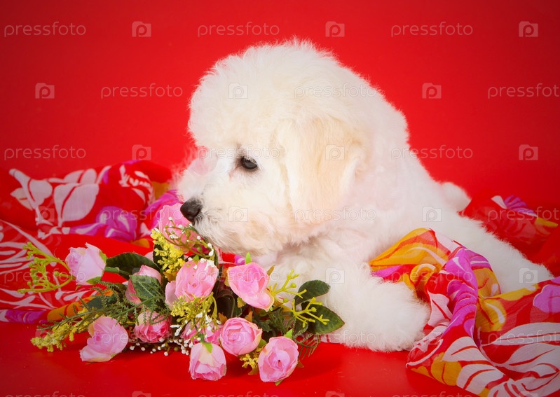 Щенок нюхает цветы