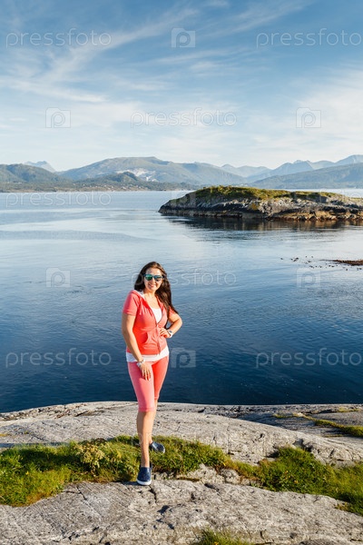 Молодая женщина с видом на норвежские фьорды