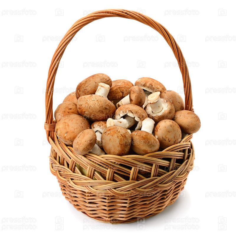 Шампиньоны в плетеной корзине на белом фоне
