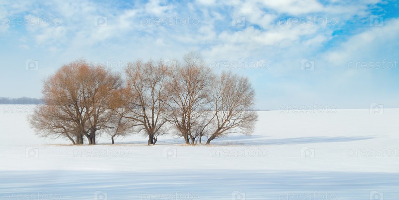 Заснеженные поля и деревья в снегу на фоне голубого неба