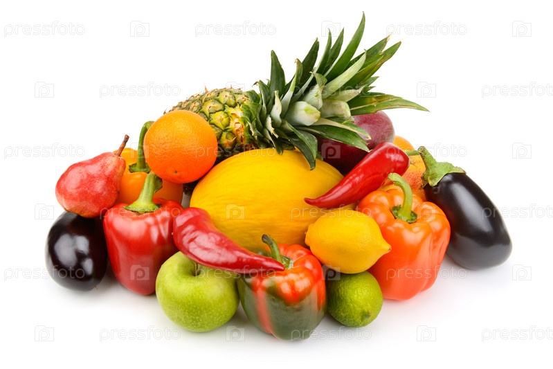 Фрукты и овощи на белом фоне