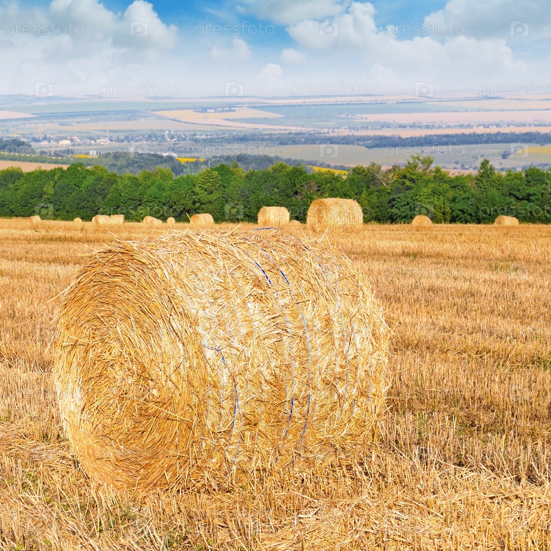 Тюки соломы на пшеничном поле