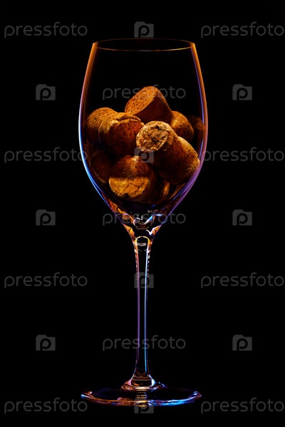 Хрустальный бокал на черном фоне с пробками от бутылок