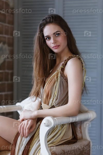 Портрет молодой красивой девушки, сидя в кресле