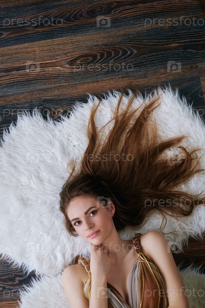 Красивая молодая девушка лежит в комнате на полу