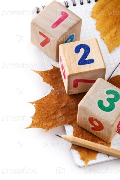Карандаш, кубики с цифрами и осенние листья на белом фоне