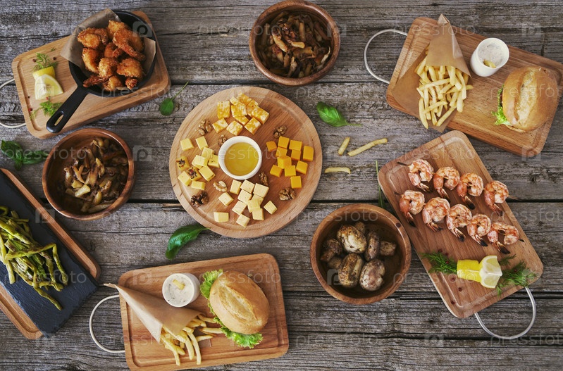 Вид сверху стола с едой и закуской