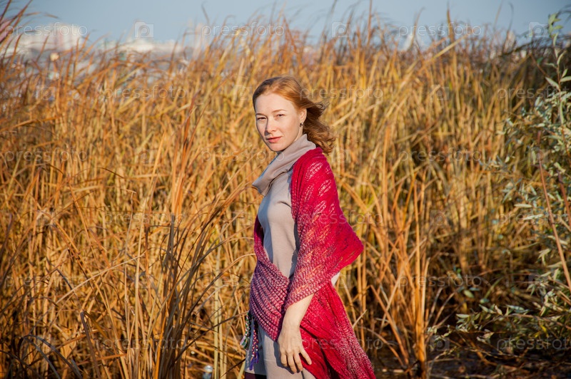 Рыжая женщина с красным платком в лучах заходящего солнца