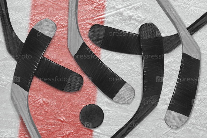 Хоккейные клюшки и шайбы на льду