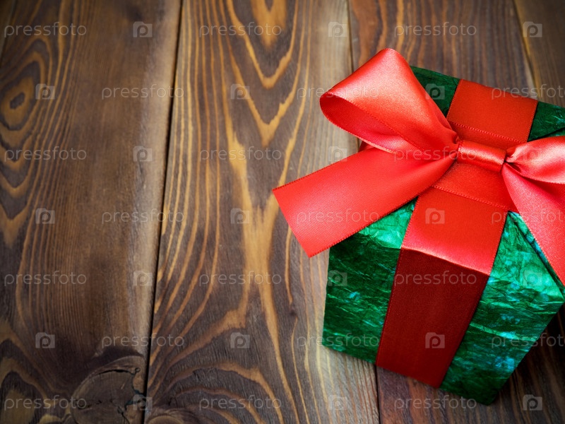 Рождественский подарок с красной атласной лентой