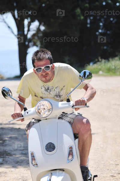 Счастливый молодой парень на скутере