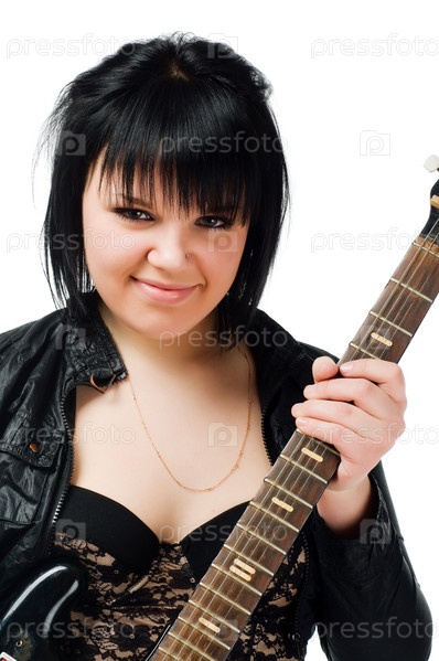 Молодая девушка с гитарой на белом фоне