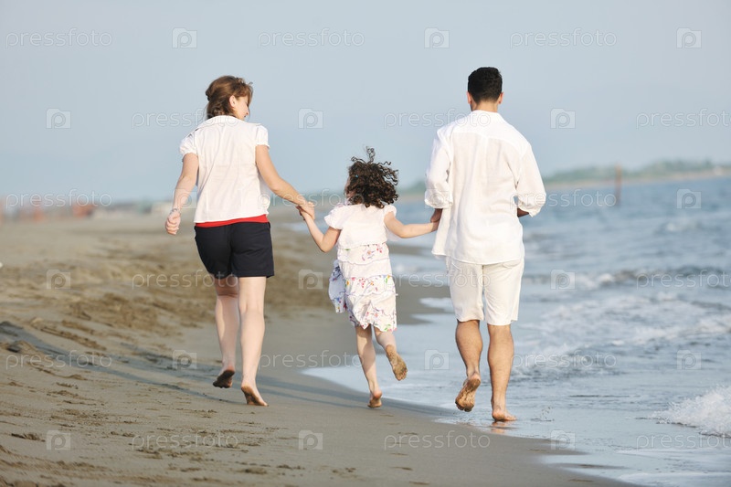 Счастливая молодая семья на пляже