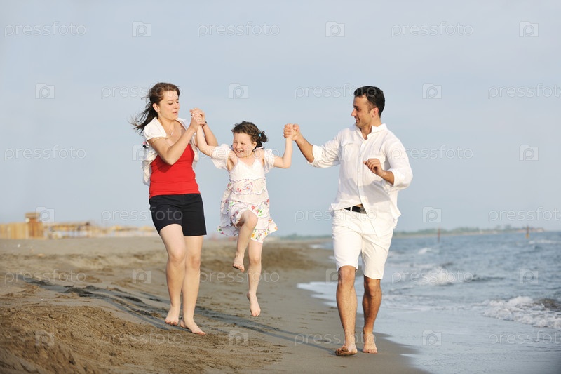 Счастливая молодая семья на пляже