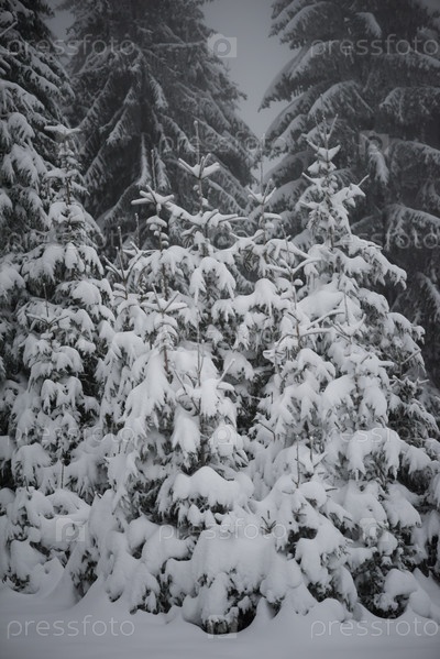 Вечнозеленые сосны покрыты свежим снегом