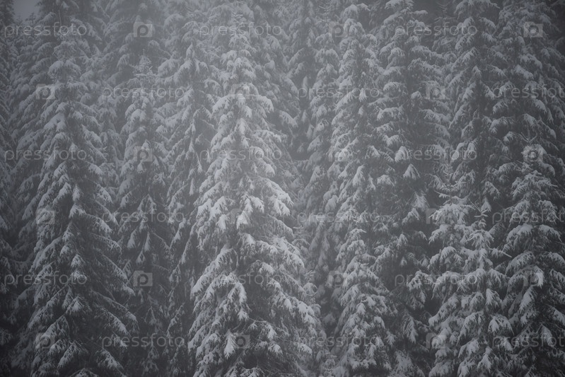 Вечнозеленые сосны покрыты свежим снегом