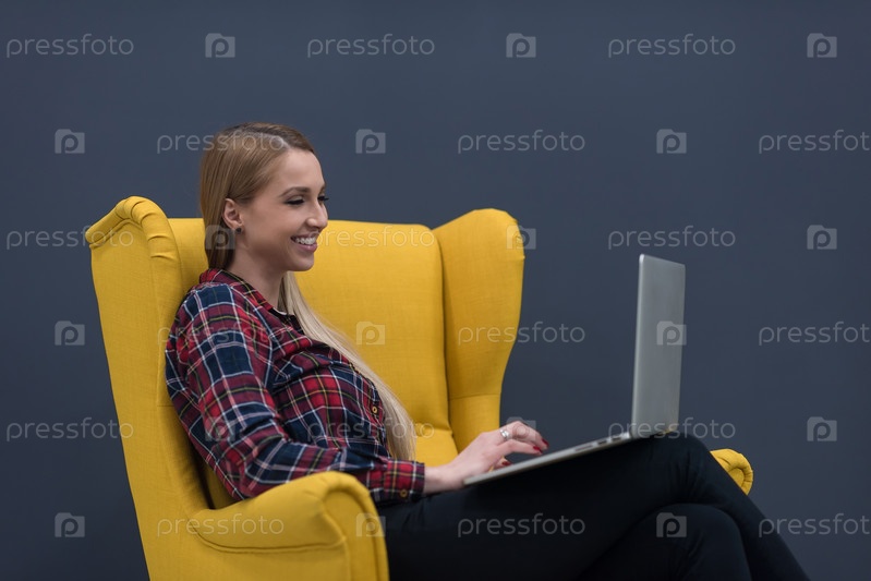Женщина с ноутбуком в желтом кресле