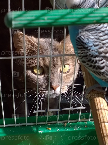 Кошка охотится на попугая