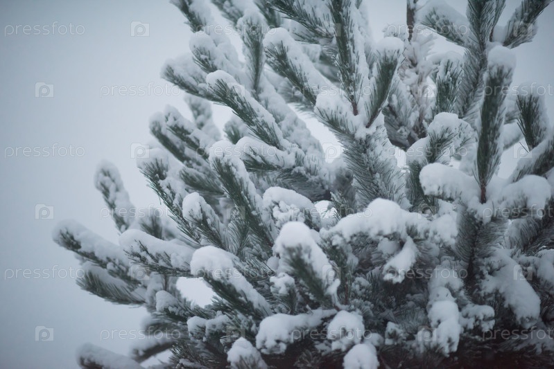 Вечнозеленые сосны покрыты свежим снегом