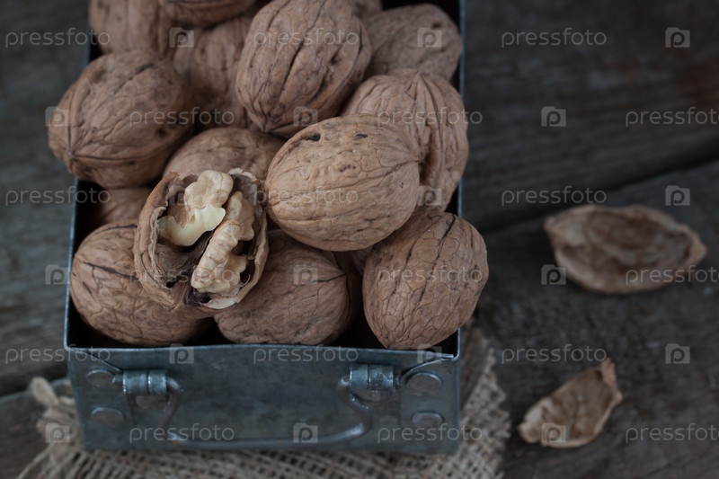 Грецкие орехи в небольшом железном ящике