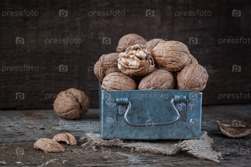 Грецкие орехи в небольшом железном ящике