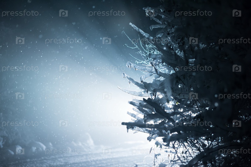 Дерево покрыто свежим снегом в зимнюю ночь