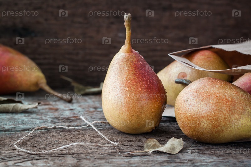 Красные и желтые груши на деревянном фоне