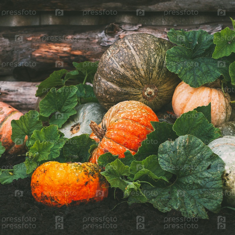 Свежесобранные тыквы в саду