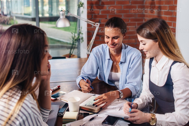 Группа веселых студенток готовят совместный проект в библиотеке
