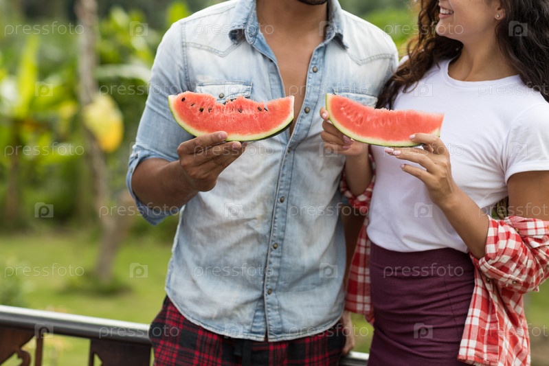 Счастливая пара ест арбуз