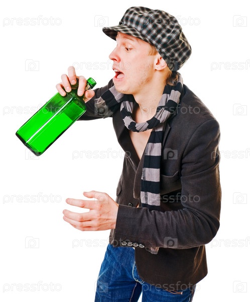 Молодой человек с зеленой бутылкой на белом фоне