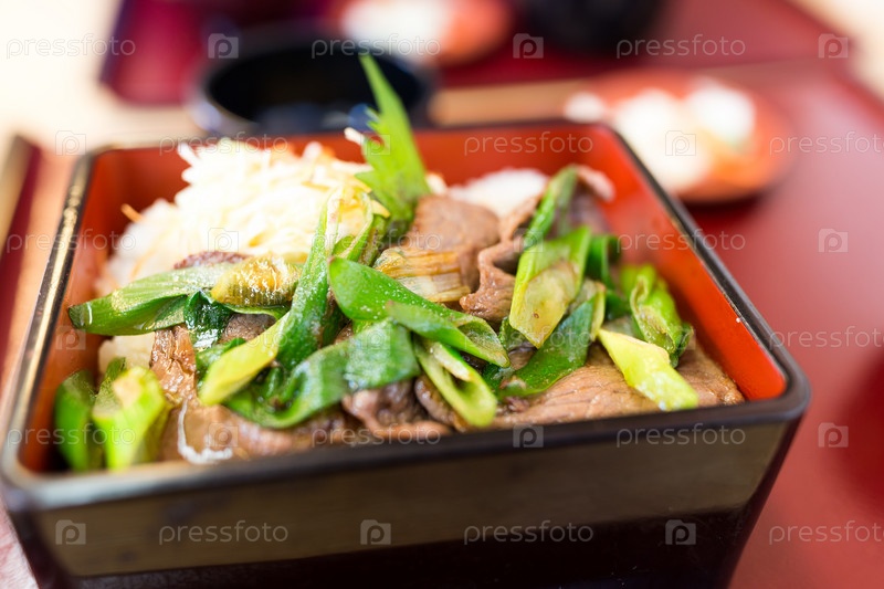 Жареная чаша риса и говядины